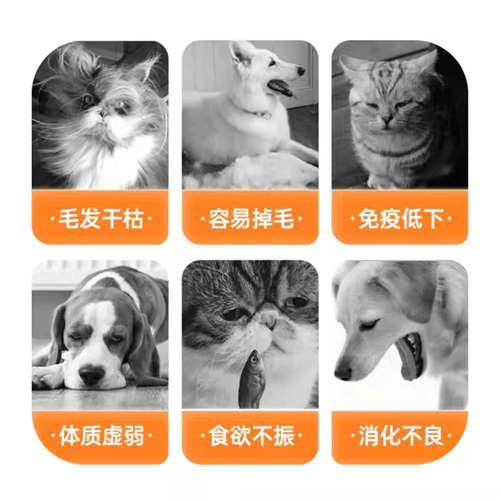 A universal nutritional supplement suitable for cats and dogs of all ages (3 months+ recommended). It targets common pet issues: dull eyes, frequent skin inflammation, loss of appetite, indigestion, dry/brittle fur, hair loss, low immunity, and general weakness.